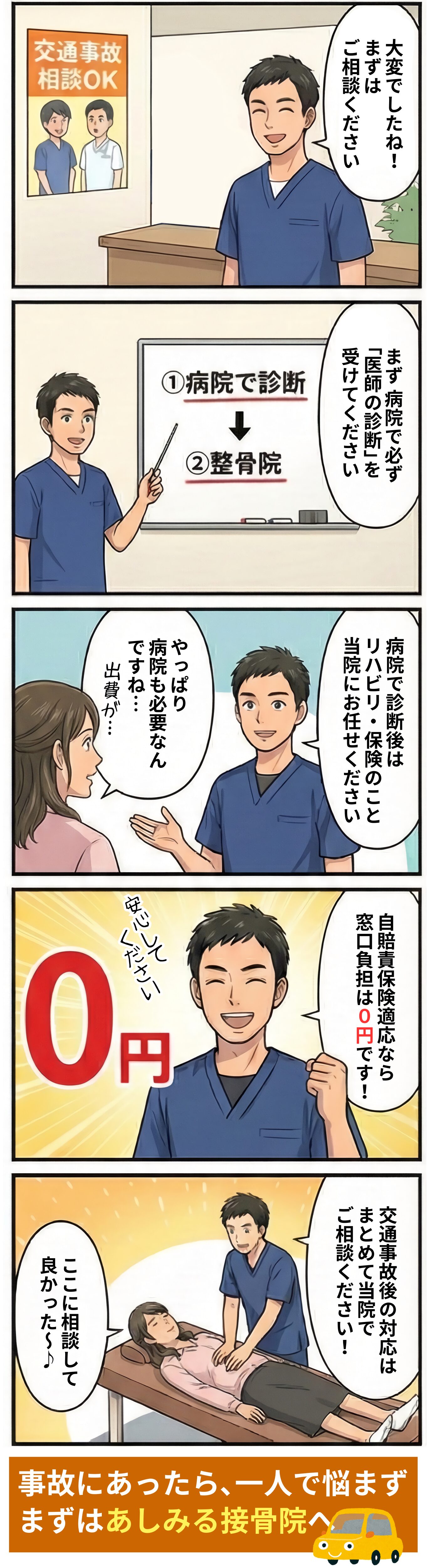交通事故に遭われてしまった場合、自賠責保険の適応により施術費用が0円となります。